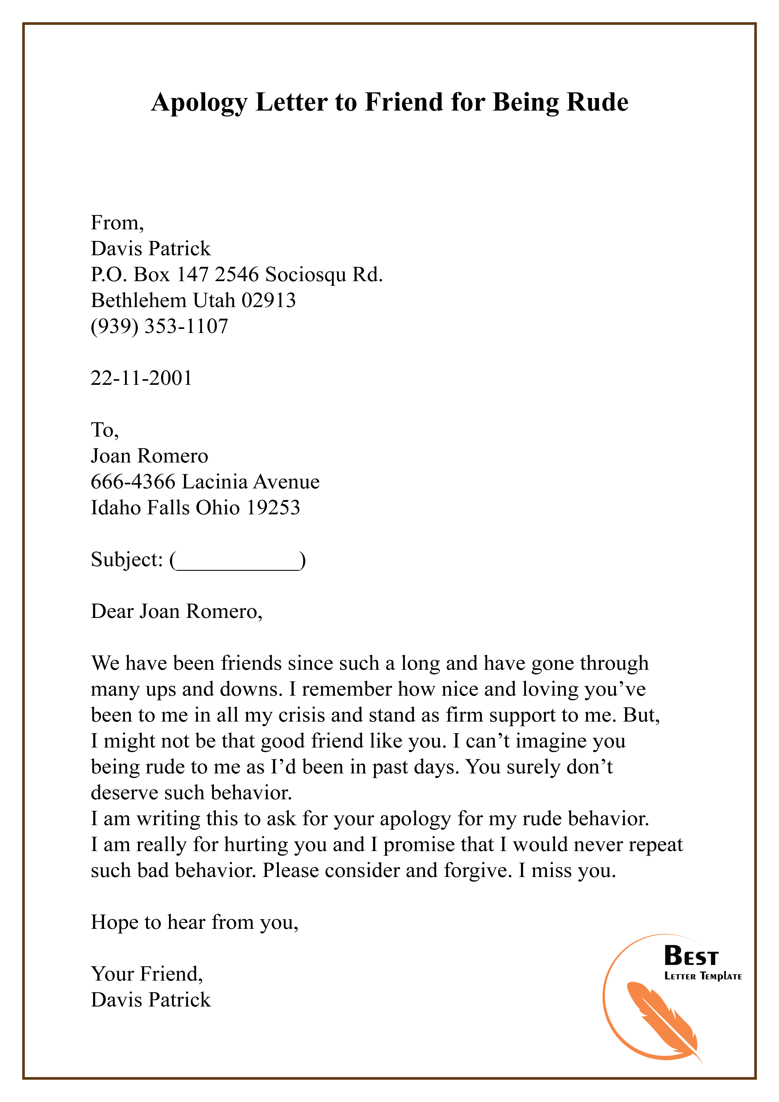 Letter of Apology for Bad Behavior to Friend - Sample Apology Letter to ...